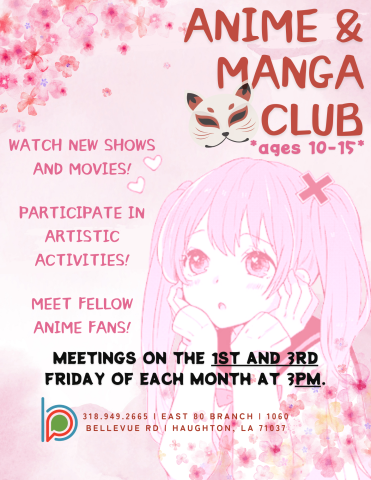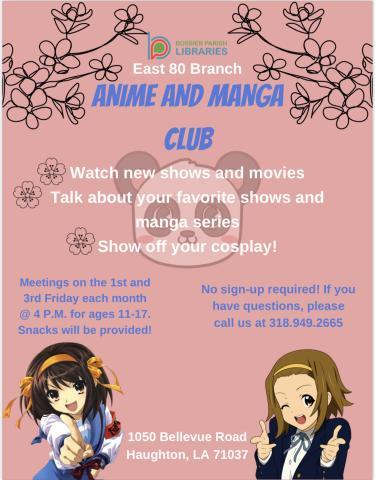 Teens can watch new Anime shows and movies, talk about their favorite shows and Manga series, and show off their Cosplay! You don't need to register. Snacks will be provided.