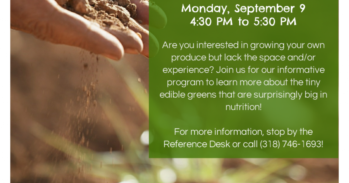 Are you interested in growing your own produce but lack the space and/or experience? Join us for our informative program to learn more about the tiny edible greens that are surprisingly big in nutrition!