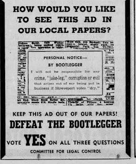 Even when Prohibition ended, some parts of the area remained “dry” by local ordinance. In an oral history interview about living through the Great Depression, Gypsy Demaris Boston, who lived in Ida, a small town just across the Red River from the north Bossier town of Plain Dealing said, “the little town that I lived in, the ward was dry, that meant that we were not allowed to sell whiskey, but you could just go five or six miles west and that ward would sell whiskey, but five or six miles was too far for many of the people to get their whiskey so there were bootleg stills around Ida and a few of them made the wrong kind of whiskey and a few people took Jake Leg disease from drinking alcohol – which was a wood alcohol and a poison - rather than the alcohol that people usually drink to get drunk on.”